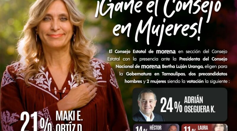 Victoria, Tamaulipas a 16 de Noviembre del 2021. El Comité Ejecutivo Nacional y el Consejo Nacional de MORENA, el día de hoy convocaron a una reunión de Consejo Estatal en Tamaulipas para que se definieran las 2 mujeres y los 2 hombres propuestos para que sean encuestados en él próximo proceso electoral que renovará la gubernatura de Tamaulipas, resultando las ganadoras por el lado de las mujeres Maki Ortiz Domínguez y Laura Moreno Trejo, así mismo, por el lado de los hombres Adrián Oseguera y Héctor Garza.