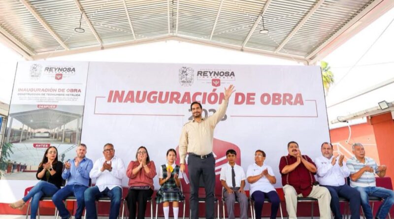 Reynosa, Tamaulipas.- Inaugurando la Techumbre Metálica en la escuela primaria Aquiles Serdán, de la colonia Rancho Grande, el Presidente Municipal Carlos Peña Ortiz, fue recibido por la Directora Wendy Roxana Castro Lores y los alumnos Briana Camila González Cruz y David Alarcón Rincón.