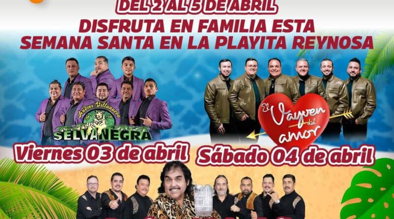 Reynosa, Tamaulipas.- El Presidente Municipal, Carlos Peña Ortiz, invita a todos, familias de Reynosa y la región, a vivir la magia de la Semana Santa 2026 en una celebración inolvidable en la Playita, disfruta de la música de Selva Negra, El Vayvén del Amor y Tropical Panamá, los días viernes 3, sábado 4 y domingo 5 de abril.